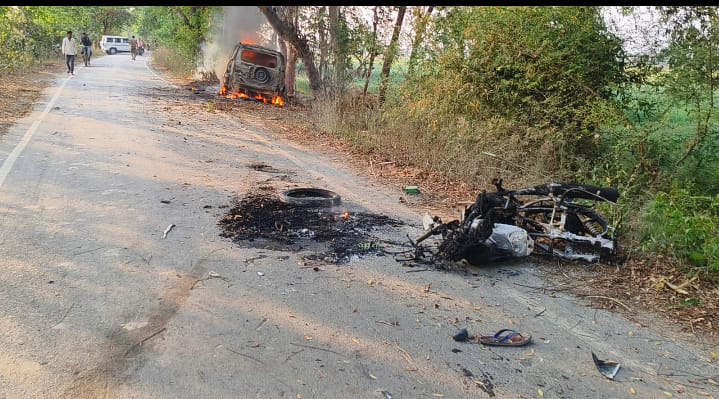 आक्रोशित भीड़ ने घटना करने वाले वाहनों में आग लगा दी घंटों धू धू कर जलती रही एस यू बी बुलोरो।