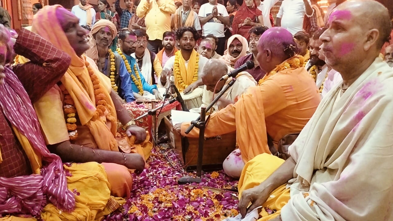 अयोध्या। गौ, संत, परमार्थ सेवा के प्रमुख केंद्र दशरथ महल, बड़ा स्थान में दशरथ महल पीठाधीश्वर विंदु गद्दाचार्य स्वामी श्री देवेंद्र प्रसादाचार्य जी महाराज की अध्यक्षता में होली मिलन समारोह संपादित हुआ। इस पुनीत अवसर पर संत, महंतों, भक्तों, अतिथियों ने एक दूसरे को अबीर गुलाल लगा कर, पुष्प वर्षा कर रंगों एवं पुष्पों की होली खेली। संतों, भक्तों गायक, वादक कलाकारों संगीतज्ञों ने अपने गायन, वादन कला का उत्कृष्ट प्रदर्शन किया।
