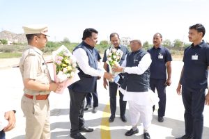राज्यपाल बागड़े के आगमन पर जनप्रतिनिधियों व अधिकारियों जिला कलेक्टर एल एन मंत्री, जिला पुलिस अधीक्षक चुनाराम जाट ने पुष्प गुच्छ भेंट किया।