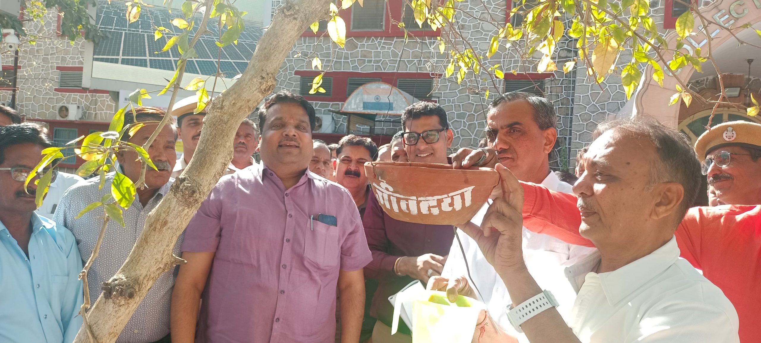 पाली में परिंदों के लिए परिंडा अभियान के तहत जिला कलेक्टर एल एन मंत्री ने किया परिंडे का आकार व पोस्टर विमोचन।