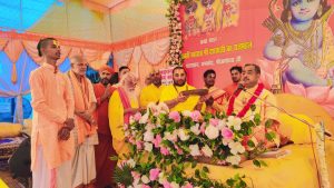 अयोध्या छठवें दिन दशरथ महल , मे अमृतवर्षा के अवसर पर। अयोध्या गो सन्त परमार्थ सेवा का प्रमुख केंद्र बिंदु गद्यचार्य के स्थान चक्रवर्ती महाराज दशरथ के राजमहल बड़ा स्थान के महन्त बिंदु गदाचार्य स्वामी देवेंद्र प्रसादाचार्य महाराज की अध्यक्षता एवं उनके प्रिय शिष्य श्रीमज्जगद्गुरु अर्जुनद्वाराचार्य महंत कृपालु राम भूषण जी महाराज व्यवस्थापकत्त्व कथा व्यास मनोज मोहन शास्त्री महाराज के श्रीमुख से वो ही श्री मद भागवत कथा में कृतकृत्य कर रहे उिन्होंने कहा कि श्रीम‌द्भागवत कथा मनुष्य के जीवन को नई दिशा देती है आगे कथा व्यास मनोज मोहन शास्त्री महाराज ने भक्तों को कथा रस का पान कराते हुए कहा कि नंद बाबा को ज्योतिषी जी ने बताया ये जिराके हृदय में प्रवेश कर जाय तो युग युगांतर के पापों को निकाल कर बाहर ले आए। बाबा ये राधा रानी के हृदय का बोर है आपका लाला कृष्ण। नंद बाबा ज्योतिषी