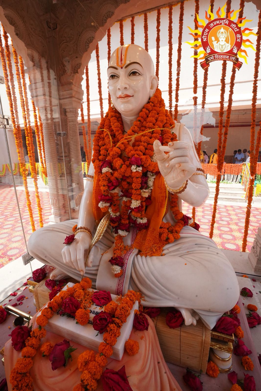 आज वैशाख कृष्ण द्वितीया विक्रम संवत 2082, 15 अप्रैल 2025 मंगलवार को श्री राम जन्मभूमि मंदिर परिसर में, यात्री सुविधा केंद्र के पूर्व दिशा के प्रवेश द्वार प्रांगण में स्थापित की गई, संत तुलसीदास जी की प्रतिमा का विधिवत पूजन करने के पश्चात लोकार्पण किया गया, वर्ष भर में जितने भी भक्तजन राम जन्मभूमि मंदिर दर्शन करने के लिए आएंगे, वहां सभी को