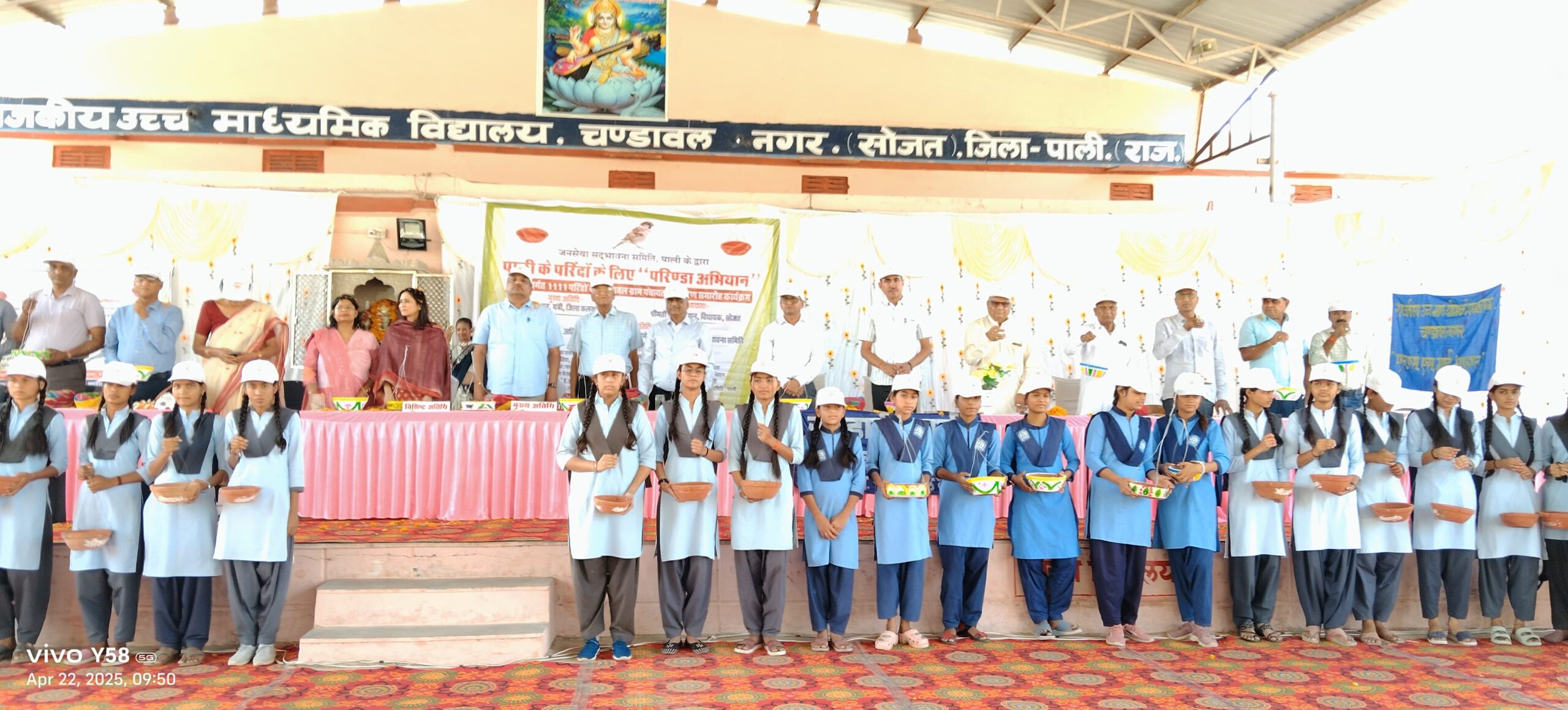 जिले के परिंदो के लिए ‘परिंडा अभियान’ जिला कलक्टर एल.एन.मंत्री के द्वारा अभिनव पहल के साथ परिंदो के लिए पानी की व्यवस्था एवं आमजन को जागरूक कर इस मुहिम में शामिल करने के उद्देश्य से जनसेवा सद्भावना समिति पाली के बैनर तले आज मंगलवार को राजकीय उच्च माध्यमिक विद्यालय चण्डावल नगर में 1111 परिंडा वितरण करने का कार्यक्रम का आयोजन समारोह के मुख्य अतिथि जिला कलक्टर एल.एन.मंत्री एवं अतिरिक्त संभागीय आयुक्त अजमेर श्रीमती दीप्ति शर्मा के सानिध्य में रंग बिरंगे कलाकृति परिंडों का वितरण किया गया जिसके तहत चण्डावल नगर ग्राम पंचायत में परिंदो के पानी पीने की समुचित व्यवस्था के लिए लगाए जाएंगे।