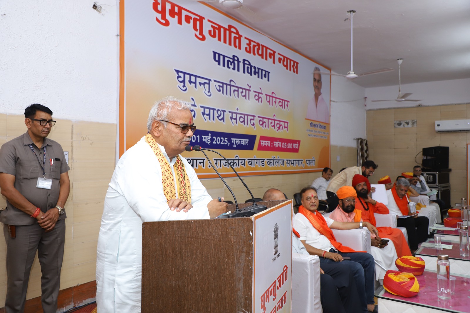 पंचायतीराज मंत्री दिलावर गुरूवार को बांगड कॉलेज में आयोजित घुमन्तु जाति उत्थान न्यास पाली विभाग द्वारा आयोजित घुमन्तु जातियों के परिवार के साथ कार्यक्रम में उपस्थित लोगों को सम्बोधित कर रहे थे।