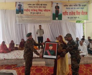 शहिद की वीरांगना लीला कंवर ने जानकारी देते हुए बताया कि 2 जून 2001 को उड़ी सेक्टर में दुश्मनों से लड़ते हुए देश के लिए अपने प्राण न्योछावर करने वाले राजेंद्र सिंह चौहान के शहादत दिवस पर पैतृक गांव राजेंद्र सिंह नगर स्थित शहीद स्मारक पर प्रतिवर्ष 2 जून को शहादत दिवस पर उनको नमन किया जाता है इसी क्रम में सोमवार 2 जून को शहीद स्मारक पर श्रद्धांजलि कार्यक्रम आयोजित किया गया कार्यक्रम में सेना के जवानों के द्वारा गॉड ऑफ ऑनर के साथ शहीद वीरांगना लीला कंवर के साथ पुष्पांजलि अर्पित कर उनको नमन किया गया ।