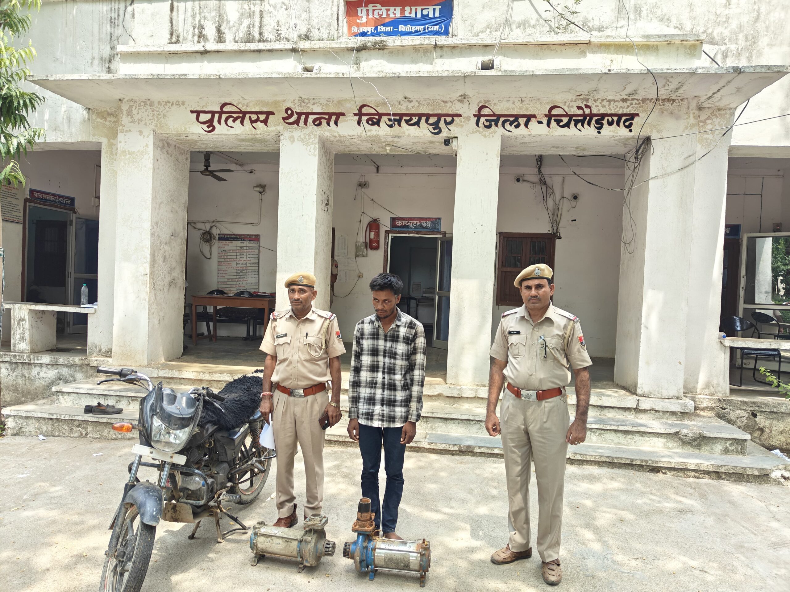 जिला पुलिस अधीक्षक श्री सुधीर जोशी ने बताया कि थानाधिकारी बिजयपुर प्रभुसिंह चुण्डावत व पुलिस टीम द्वारा एएसपी सरिता सिंह के निर्देशन व डीएसपी ग्रामीण चितौडगढ शिवप्रकाश टेलर के सुपरविजन में अवैध गतिविधियों की निगरानी व धरपकड़ हेतु शुक्रवार को बिजयपुर से कनेरा की तरफ रास्या मंगरी तिराया पर नाकाबन्दी की जा रही थी। इसी दौरान एक मोटरसाईकिल पर दो व्यक्ति बिच में एक प्लास्टिक के कटटे में कोई भारी सामान लेकर आये जो एकाएक पुलिस नाकाबन्दी को देखकर पिछे मुड भागने लगे, जिन्हे नाकाबन्दी टीम द्वारा पिछा कर एक व्यक्ति को पकडा व मोटरसाईकिल पर रखे कटटे को चैक किया तो उसमें भारी पानी की मोटरें पाई गई। पकडे गये व्यक्ति बेगूं थानांतर्गत कुलाटीया निवासी रतनदास पुत्र हाबु दास से मोटरों के बारे मे पुछताछ कि गई तो संतोषप्रद जबाव नही दिया। जब तसल्ली पुर्वक पुछताछ की गई तों मोटरे रास्या मंगरी व कर्मा खेडा के पास कुओं से चोरी करना बताया। भागे गये व्यक्ति का नाम पुछा तो भैरूलाल पुत्र चुन्नीलाल भील निवासी देदीया थाना बैगु जिला चितौडगढ़ होना बताया। आरोपी से बरामद मोटरें चोरी के संबंध में प्रकरण होने से मौके से ही रतनदास के कब्जे से पानी की मोटरें व मोटरसाईकिल बरामद की गई। पुलिस की विस्तृत पुछताछ में आरोपी ने पानी की मोटरें चोरी की करीब आधा दर्जन वारदातें कर्मा खेडा, रास्या मंगरी व एमपी में रतनगढ़ थाना क्षेत्र के गाँव से किया जाना बताया। गिरफतार आरोपी से विस्तृत पुछताछ की जा रही है। साथी आरोपी की भी तलाश प्रारम्भ की गई।