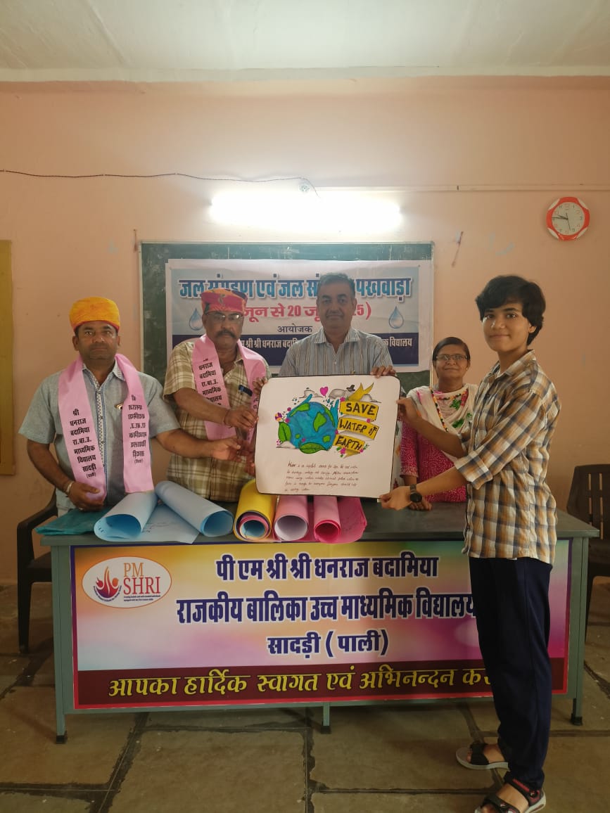 5जून से शुरू हुए जल संग्रहण एवं जल संरक्षण पखवाड़े के तहत स्थानीय पीएम श्री श्री धनराज बदामिया राजकीय बालिका उच्च माध्यमिक विद्यालय सादड़ी में प्रधानाचार्य विजय सिंह माली व समाजसेवी हिम्मत परिहार व भंवर लाल घांची के सानिध्य में चार्ट निर्माण प्रतियोगिता का आयोजन किया गया तथा सभी ने जल संग्रहण व संरक्षण की शपथ ली।