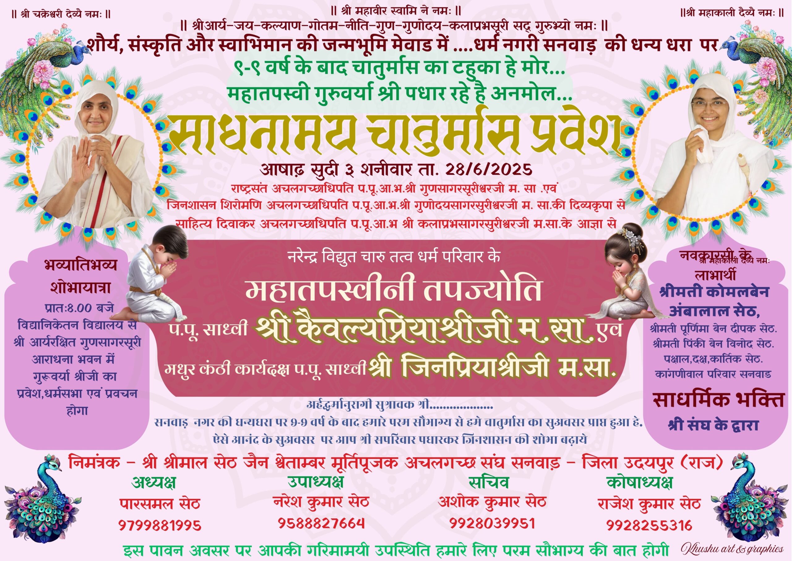 श्रीमाल सेठ जैन श्वेतांबर मूर्ति पूजक अचलगच्छ संघ सनवाड़ के संचिव अशोक कुमार सेठ ने बताया कि राष्ट्रसंत अचल गच्छाधिपति परम पूज्य आचार्य भगवन श्री गुण सागर सुरिश्वर जी महाराज साहब एवं जिन शासन शिरोमणि अचल गच्छाधिपति परम पूज्य आचार्य भगवन श्री गुणोदय सागर सुरिश्वर जी महाराज साहब की दिव्या कृपा एवं साहित्य दिवाकर अचल गच्छाधिपति परम पूज्य आचार्य भगवन श्री कलाप्रभ सागर सुरिश्वर जी महाराज साहब की आज्ञा से नरेंद्र विद्युत चारु तत्व धर्म परिवार के महा तपस्विनी तप ज्योति परम पूज्या साध्वी श्री कैवल्य प्रिया श्री जी महाराज साहब व मधुर कंठी कार्य दक्ष परम पूज्या साध्वी श्री जिन प्रिया श्री जी महाराज साहब का मंगल चातुर्मास सनवाड़ श्री संघ को प्राप्त हुआ। जिनका चतुर्मासिक मंगल प्रवेश 28 जून शनिवार को होने जा रहा है। विद्या निकेतन विद्यालय से प्रातः 8:00 बजे भव्यातिभव्य शोभायात्रा प्रारंभ होगी जो आर्य रक्षित गुण सागर सूरी आराधना भवन में पहुंच कर धर्म प्रवचन सभा में परिणित हो जाएगी। चातुर्मास प्रवेश को लेकर श्री संघ में उत्साह का वातावरण है चातुर्मास को सफल बनाने में अध्यक्ष श्री पारसमलजी सेठ उपाध्यक्ष श्री नरेंशकुमार जी सेठ कोषाध्यक्ष श्री राजेश कुमार जी सेठ सहित संघ के सभी पदाधिकारी कार्यकर्ता एवं सभी सदस्य गण तैयारी लगे हुए हैं। इस कार्यक्रम में नवकारसी के लाभार्थी श्रीमती कोमल बेन अंबालाल जी सेठ कांगणीवाल परिवार सनवाड़ व साधार्मिक भक्ति श्री संघ के द्वारा रखी गई है।