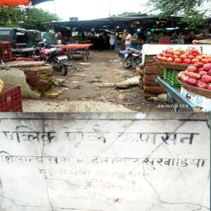 फोटो,,कपासन की वर्तमान सब्जी मंडी और मंडी के बाहर दीवार पर लगी गार्डन की शिलान्यास पट्टिका।