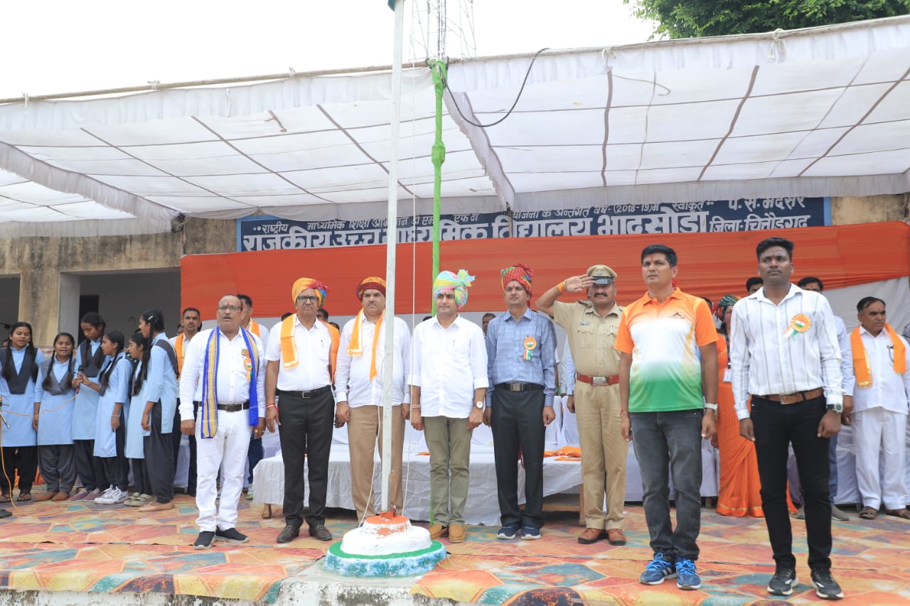 स्वतंत्रता दिवस हर्षोल्लास के साथ मनाया गया खबर भादसोडा कस्बे में राजकीय उच्च माध्यमिक विद्यालय में स्वतंत्रता दिवस हर्ष उल्लास के साथ मनाया गया जिसमें मां सरस्वती का दीप प्रज्वलित माला अर्पित कर कार्यक्रम की शुरुआत की कार्यक्रम के मुख्य अतिथि ग्राम पंचायत सरपंच प्रशासक शंभू सुथार ने की कार्यक्रम की अध्यक्षता रमेश चंद्र सुथार ने की कार्यक्रम की विशिष्ट अथिति नायब तहसीलदार शिव शंकर पारीक थानाधिकारी महेंद्र गुर्जर मंदिर कमेटी के उपाध्यक्ष बाबूलाल ओझा अशोक अग्रवाल महात्मा गांधी विद्यालय के संस्थाप्रधान ज्योति शर्मा पंचायत समिति सदस्य सोनी रमेश चंडालिया जगदीश तेली आदि उपस्थित थे अतिथियों को कुमकुम का तिलक एवं उपरनापहनाकर स्वागत अभिनंदन किया बच्चों ने देशभक्ति के परेड़ पीटी सांस्कृतिक कार्यक्रम नन्हे मुन्ने बच्चों ने कई तरह की प्रस्तुतियां पेश की और कक्षा 12वीं में पढ़ने वाले छात्राओं ने उच्च अंक लाने वाले बालक बालिकाओं को चेरी ट्रस्ट रतन वृद्धि मोतीलाल मेहता की ओर से बालक बालक एक में बालक ने बालक बालिकाओं को दो को तो 5000 का चेक 1 को 3000 का चेक दिया गया हेल्पिंग हेडस की प्रतिभाओं का शाल ओड़ाकर सम्मानित किया गया सभी को प्रतिज्ञा दिलाई गई की के चुनाव में अधिक से अधिक मतदान कर करें से भामाशाह का मुकेश कुमार बडवा का शाल ओढ़ाकर स्वागत किया मुकेश कुमार बड़वा की ओर से नन्हे मुन्ने बालकों को समझ भोजन प्रसादी का कार्यक्रम किया गया कार्यक्रम का संचालन गंगाराम खटीक ने किया आभार व्यक्त दीक्षा तुसावड़ा ने आभार व्यक्ति किया