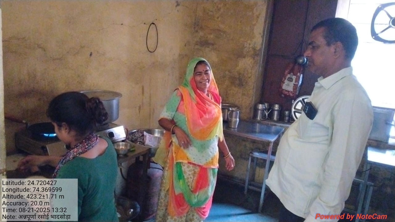 ग्राम भादसोड़ा में संचालित श्री अन्नपूर्णा रसोई योजना ग्रामीण का निरीक्षण पंचायत समिति भदेसर से सहायक विकास अधिकारी भीमराज जायसवाल द्वारा किया गया निरीक्षण के दौरान उपस्थित कार्मिकों को आवश्यक दिशा निर्देशों के अलावा स्वच्छता का विशेष ध्यान रखने एवं श्री अन्नपूर्णा रसोई पर डस्टबिन रखने एवं भोजन का मेनू प्रदर्शित करने हेतु डिस्प्ले बोर्ड लगाने के लिए निर्देशित किया गया। इंजेक्शन के दौरान उपस्थित लाभार्थियों से भोजन की क्वालिटी एवं परोसने वाली भोजन की मात्रा के बारे में जानकारी की गई।