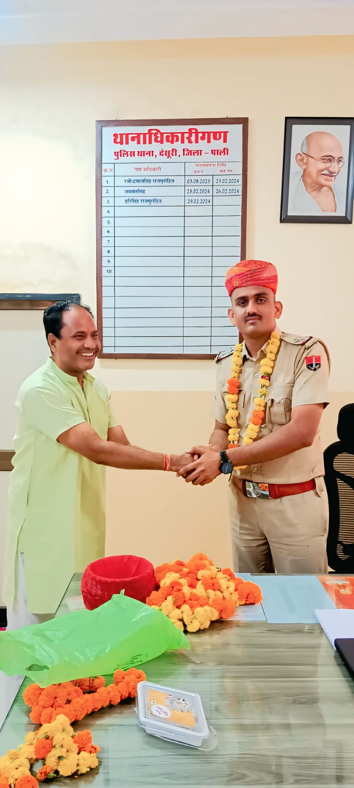 देसूरी थाना प्रभारी हरिसिंह राजपुरोहित C I बन कर पर वापिस देसूरी आने पर देसूरी भाजपा मंडल बूथ अध्यक्ष घनश्याम छिपा मोतीलाल माली द्वारा साफा माला पहनाकर स्वागत किया गया उनको उज्वल भविष्य जिस पर सभी जन प्रतिनिधि और सभी ग्राम वासियों ने शुभकामनाएं एवं बधाई दी।