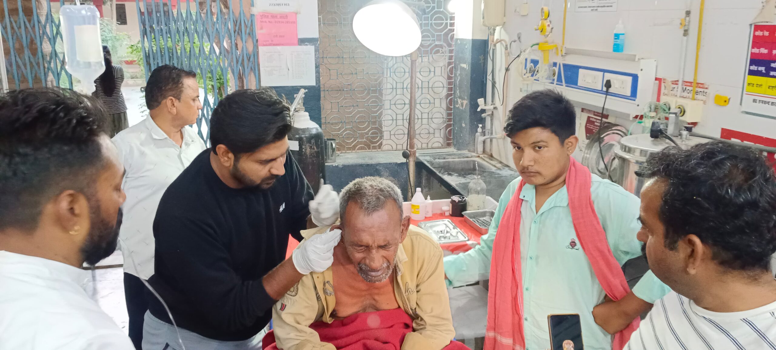 सादड़ी. मधुमक्खियों के हमले में घायल वृद्ध का उपचार करते चिकित्सक।