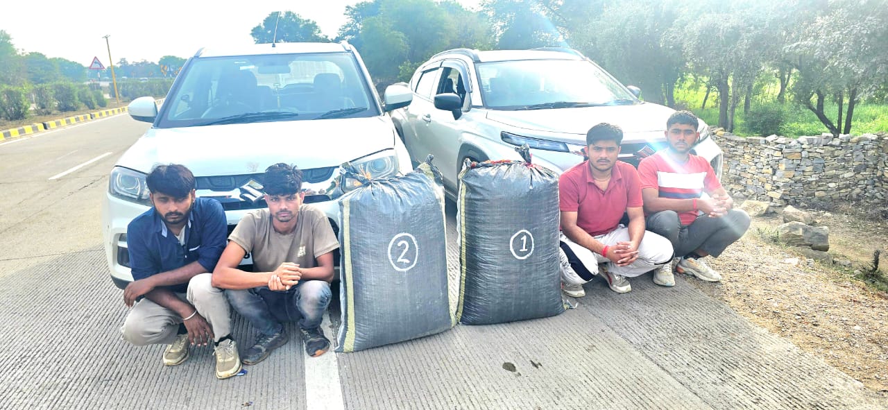 कार से 44 किलो 300 ग्राम से अवैध अफीम डोडा चूरा जब्त, एस्कोर्टिंग करती कार के साथ चार आरोपी गिरफ्तार।