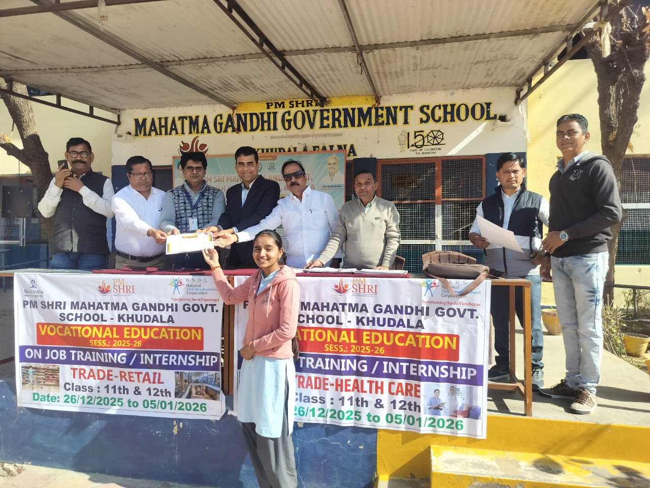 केंद्र सरकार संचालित व्यावसायिक शिक्षा की ओर से पीएम श्री महात्मा गांधी राजकीय विद्यालय खुडाला में शीतकालीन सत्र 2025-26 में कक्षा 11 व 12 वीं के विद्यार्थियों का प्रधानाचार्य श्री राजेश पूरी के मार्गदर्शन में 10 दिवसीय शिविर ऑन जॉब ट्रेनिंग व इंटर्नशिप दिनाँक 26-12-25 से 05-01-26 तक रिटेल ट्रेड का रिलाइंस स्मार्ट पॉइंट फालना में व हेल्थ केयर ट्रेड का राजकीय प्राथमिक स्वास्थ्य केंद्र खुडाला फालना में आयोजन किया । जिसमे विद्यार्थियों को कौशल ज्ञान का प्रशिक्षण दिया गया है। आज कार्यक्रम के समापन पर मुख्य अध्यक्ष के रूप में स्थानीय विद्यालय के प्रधानाचार्य श्री राजेश पूरी, स्थानीय अस्पताल के कार्मिक श्रीमान भंवर वैष्णव,विशिष्ठ अतिथि समाजसेवी अमित मेहता,वीरेन्द्र सिंह फोजदार अशोक पारेख की अध्यक्षता में सम्पन हुआ | स्थानीय विद्यालय के व्यावसायिक शिक्षा प्रभारी महेंद्र सिंह चावड़ा व व्यावसायिक प्रशिक्षक (रिटेल)श्री हिम्मत परमार व व्यावसायिक प्रशिक्षक ( हेल्थ केयर ) रमेश कुमार ने बताया कि शिविर में विद्यार्थियों को कौशल की जानकारी दी तथा उनके ट्रेड संबंधित जानकारी दी ।जिससे वह बेरोजगार न रहे इस अवसर पर स्थानीय विद्यालय के समस्त ऑन जॉब ट्रेनिंग व इंटर्नशिप करने वाले विद्यार्थियों को प्रमाण पत्र वितरित कर उनके उज्ज्वल भविष्य की कामना व उनका मार्गदर्शन किया*