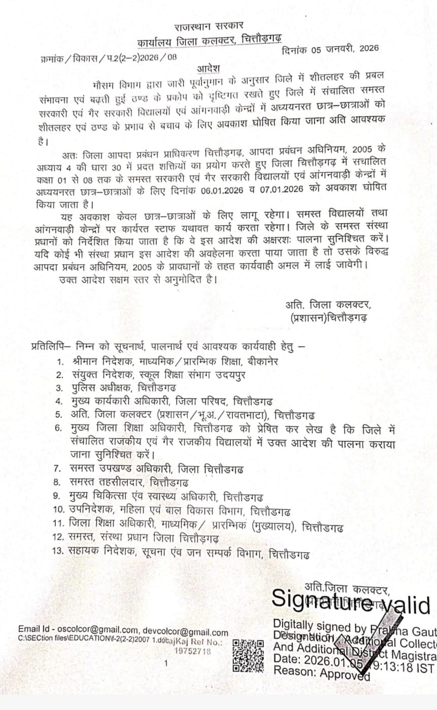 शीतलहर के मद्देनज़र कक्षा 1 से 8 तक के विद्यालयों व आंगनवाड़ी केन्द्रों में दो दिवसीय अवकाश घोषित।