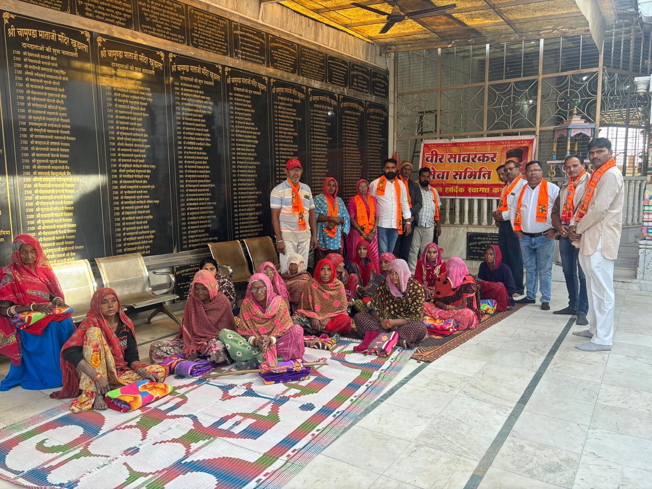 स्वतंत्रत वीर सावरकर सेवा समिति के तत्वाधान में आज कंबल वितरण का कार्यक्रम को खुडाला माताजी मंदिर पर संपन्न हुआ इस अवसर पर सेवा समिति के अध्यक्ष ख़ुशाल चौधरी ने कहा कि गरीबों की सेवा ही सच्ची सेवा होती है और इससे बढ़कर कोई नहीं हो सकती है एवम् उन्होंने आगामी कार्यक्रम समिति के द्वारा जो आयोजित किए जाएंगे उसके बारे में भी चर्चा की गई इस अवसर पर कंबल पाकर लोगों के चेहरों पर ख़ुशी देखने को मिली इस अवसर पर सेवा समिति के अध्यक्ष कुशाल चौधरी प्रवीण परिहारीया,अमित मेहता,नैनराम,प्रकाश चौधरी,हरीश परमार ,सवाराम गवारीया,विनोद ओजा,ख़ुशाल,मदन वैष्णव, वक्तू मीना,भवरी कवर आदि लोग उपस्थित रहे।